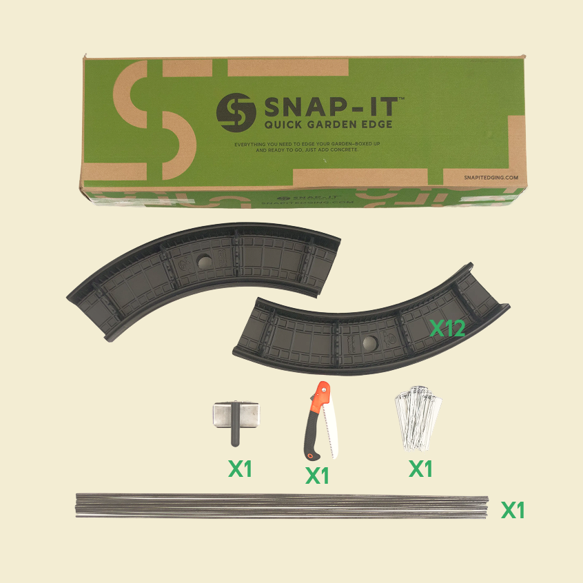You’ll need a spade, snips (for trimming components), steel rebar (included in most kits), a hammer or mallet, and a SNAP-IT Finishing Trowel (included in most kits or sold separately). A string line or chalk is helpful for layout.